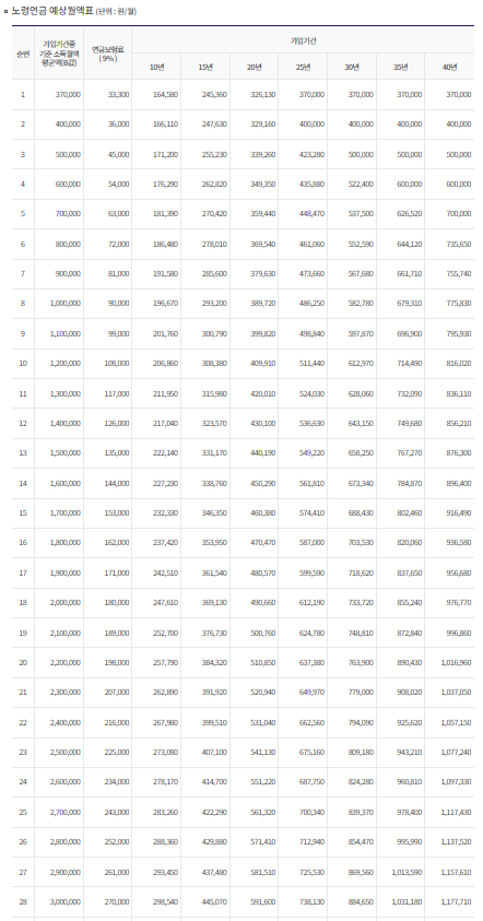 아직 노령연금 연령이 안되신 분들은 예상 월액표 보시고 미리 알아보 실 수도 있습니다.