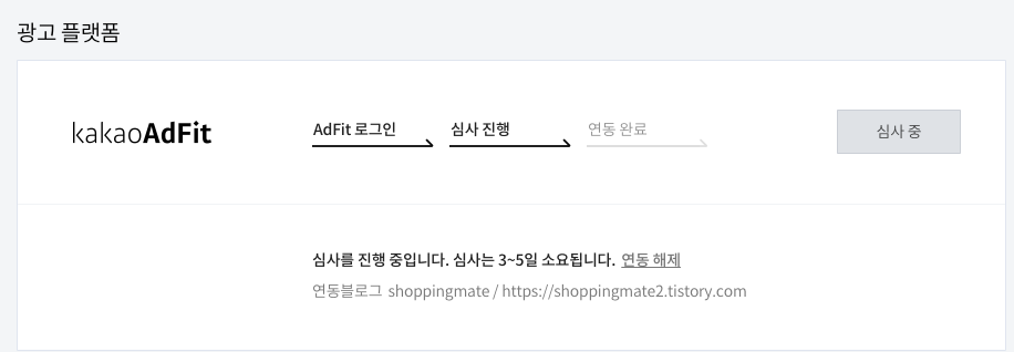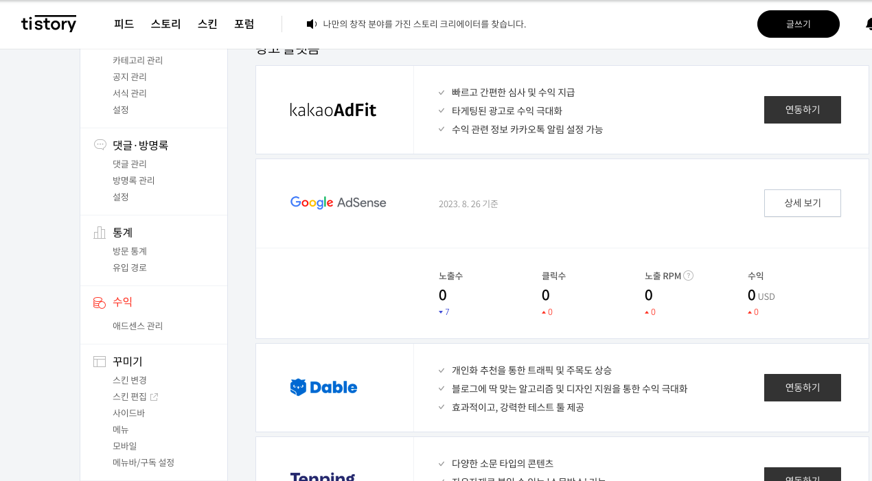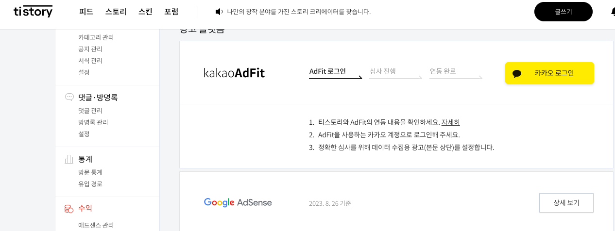 티스토리 관리자 창에서 수익 -> 오른쪽에 카카오 애드핏 연동하기 눌러줍니다.