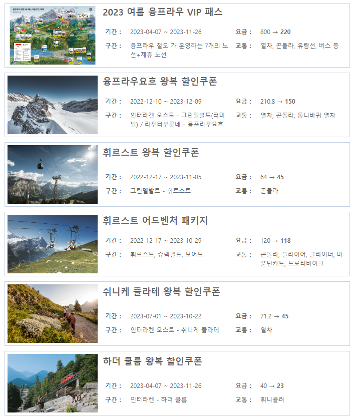 융프라우 VIP 패스와 융프라우요흐 왕복권을 가장 많이 사용하는데 저는 융프라우요흐 왕복 할인쿠폰을 이용하려고 합니다. 각자 일정에 맞는 쿠폰으로 받으시면 됩니다.